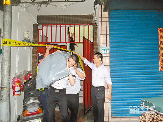 房客殺害房東雙尸案,殯葬業者將房客遺體運出。(圖片來源:臺灣《中國時報》)