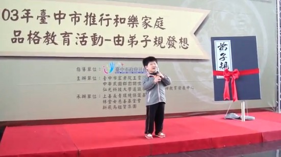 臺中市社會局、臺中市宏孝院玉霄清虛全真協(xié)會、財(cái)團(tuán)法人上善長青環(huán)境保護(hù)基金會等民間團(tuán)體,舉辦弟子規(guī)背誦競賽活動,將于12月1日開始報名,并于明年2月開始比賽,冠軍的參賽者將可獲得新臺幣20萬元新臺幣獎金。