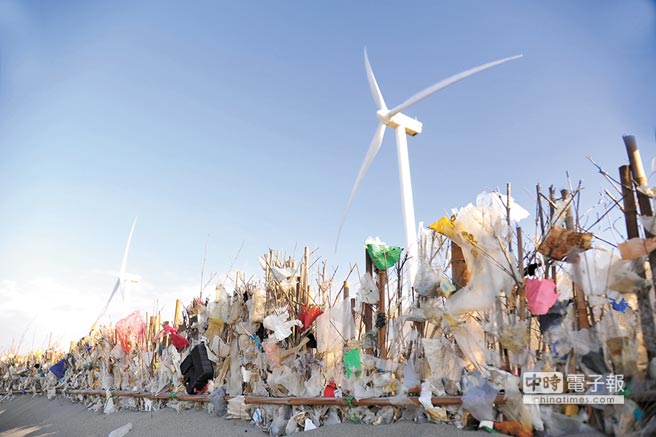 彰化海岸的竹籬上掛滿垃圾。(圖片來自臺媒)