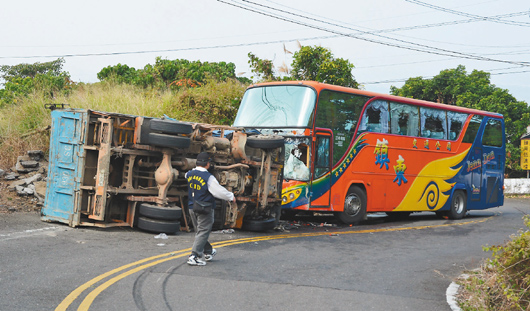 由黃姓司機(jī)駕駛的砂石車(chē),昨天上午9時(shí)27分,滿載廢柏油塊下山,不知何故,失控翻覆沖到對(duì)向車(chē)道,撞向正要上山的游覽車(chē)。