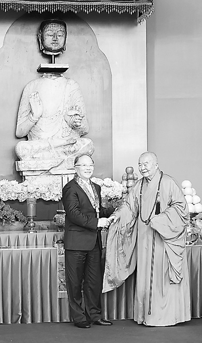 五月二十三日,“金身合璧 佛光普照”河北幽居寺佛首捐贈儀式在臺灣高雄佛光山舉行。這尊原供養在河北省靈壽縣幽居寺塔的北齊漢白玉釋迦牟尼佛像有上千年歷史,佛首一九九六年被盜。二○一四年,臺灣佛光山星云大師接受了信眾捐贈的一尊漢白玉佛首,經鑒定為河北幽居寺釋迦牟尼佛被盜的佛首。去年十二月,臺灣佛光山文教基金會與中華文物交流協會簽署協議,將佛首無償捐贈中華文物交流協會。圖為星云大師(右)與中華文物交流協會會長勵小捷出席捐贈儀式。新華社發(佛光山供圖)