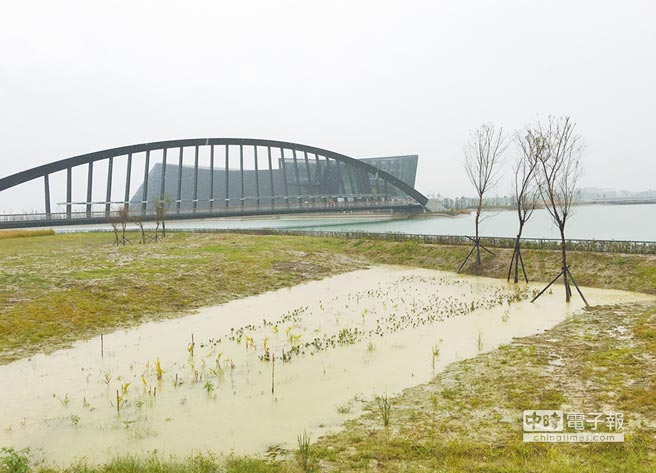 臺北故宮南院外的景觀園區雖尚未完工,但部分低洼地區積水嚴重。圖片來源:臺灣《中時電子報》