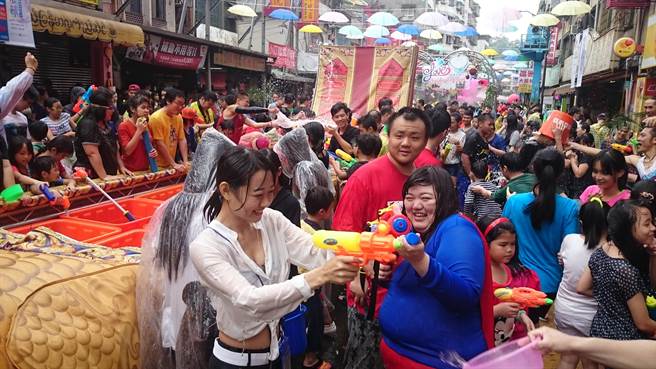 新北市潑水節今天在新北中和區華新街登場,民眾拿起水槍大打水仗,玩得不亦樂乎。(圖片來源:臺灣“中時電子報”)