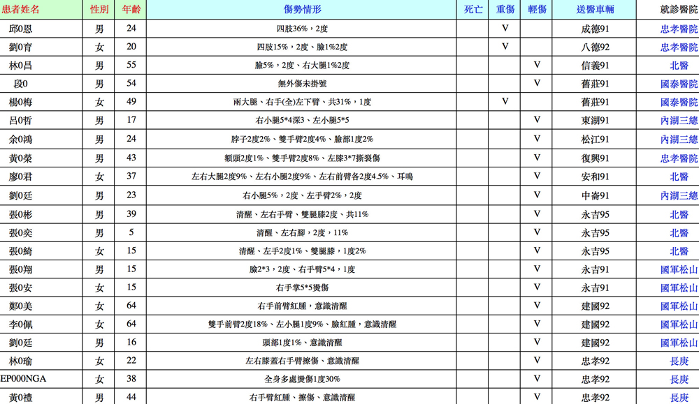 據(jù)臺(tái)灣東森新聞云報(bào)道,共有21人受到輕重不等的灼傷。根據(jù)臺(tái)北市消防局統(tǒng)計(jì),21名受傷者分別被有3人被送往內(nèi)湖三總醫(yī)院、2人送到忠孝醫(yī)院、6人送至北醫(yī)、5人到松山臺(tái)軍醫(yī)院、2人到國(guó)泰醫(yī)院、3人至臺(tái)北長(zhǎng)庚醫(yī)院。傷者除撕裂傷、吸入性嗆傷外,還有部分傷員因受面積不等的1至3度灼傷,被送往加護(hù)病房治療,其中北醫(yī)就占了3位。