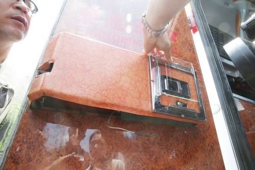 紅珊瑚車隊同款游覽車的安全門鎖,正常開啟方式,是得先取下壓克力板,才能開啟開關。(圖片來源:臺灣《聯合報》)