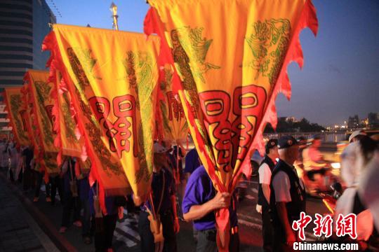 福建東山關帝神像16日下午從澎湖運抵高雄,來自全臺各地的21家關帝神廟數千信眾到高雄香蕉碼頭接駕,晚上舉行踩街活動。 徐德金 攝