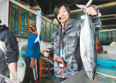 3月8日,黃紋綺在與“洄游吧”合作的定置漁場內查看剛捕獲的魚。