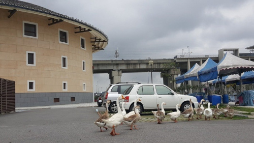 苗栗縣知名景點“客家圓樓”周邊水域放養的華鵝、綠頭鴨等水禽,最近頻頻上岸“逛大街”,工作人員不停忙著驅趕回池。臺灣《聯合報》記者胡蓬生/攝影