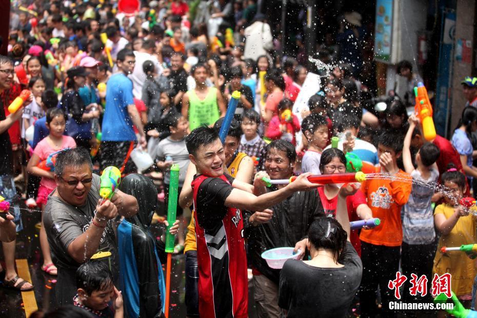 4月16日,臺灣新北市潑水節(jié)在永和區(qū)華新街舉行。華新街有“緬僑街”之稱,為早期南洋華僑遷居,主要以美食觀光業(yè)為主,自1998年起在這里舉辦的潑水節(jié)已經(jīng)成為當(dāng)?shù)胤浅S刑厣囊豁椈顒樱磕甓嘉簧倜癖妳⒓印D為新北市潑水節(jié)現(xiàn)場。 中新社記者 龍敏 攝