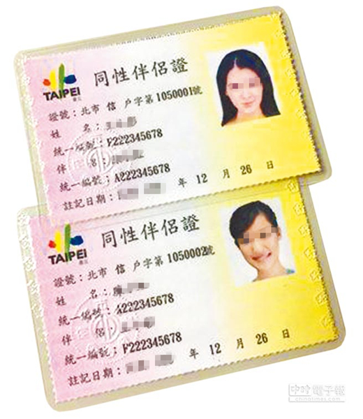 圖為臺北市政府發出的“同性伴侶證”。(圖片來源:臺灣《中時電子報》)