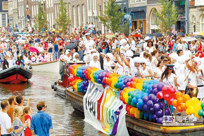 荷蘭于2001年4月1日正式承認同性婚姻合法化,是全球第一個承認同性婚姻的國家。圖為2011年8月6日,荷蘭阿姆斯特丹王子運河的船只游行活動中,代表“同性戀”的船只在萬眾矚目下通過運河。(圖片來源:臺灣《中時電子報》)