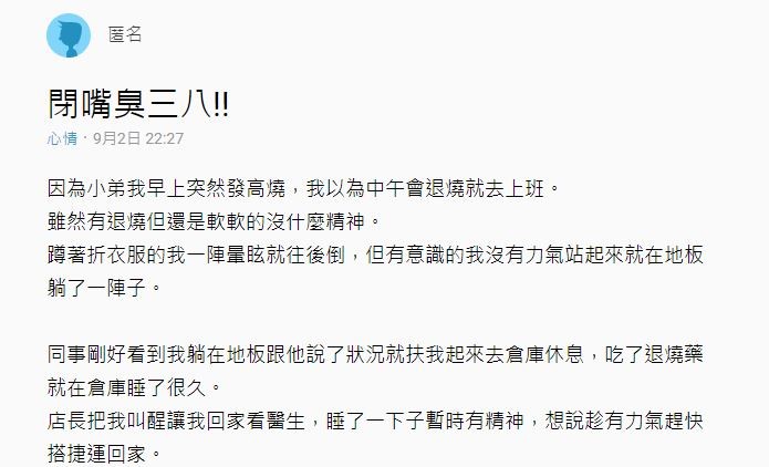 據臺灣“東森新聞云”報道,一青年近日在臺灣的社交媒體上表示,自己當天早上突然發高燒,本以為中午就能退燒所以照常去上班,結果卻在工作中突然暈眩倒地全身都沒有力氣。后來看完醫生后搭捷運回家,有人看他身體不舒服便讓座給他,有了座位的他還在車上小睡了一陣子。