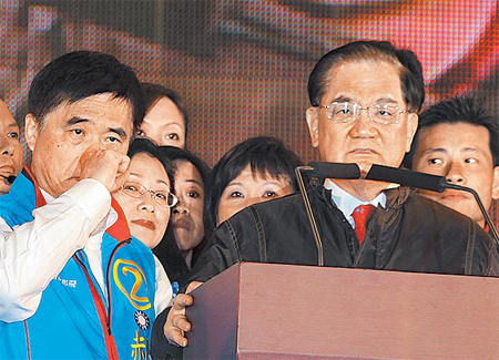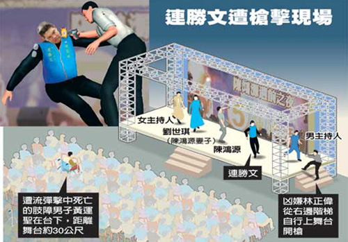 胡志強26晚在臺中洲際棒球場舉行的造勢晚會上,“立委”盧秀院宣布連勝文遭槍擊時,現場一片驚愕,不敢相信這個消息。來源:臺灣《中國時報》
