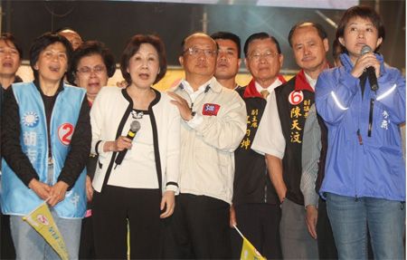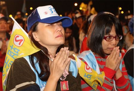 胡志強26晚的造勢晚會上,民眾雙手合十為連勝文祈福。來源:臺灣《中國時報》