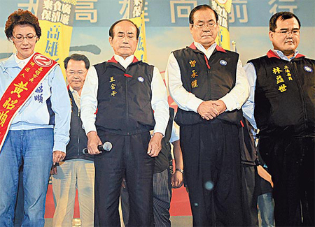 臺灣“立法院長”王金平(中)與黃昭順(左二)等競選團隊成員,26日在造勢晚會上為連勝文祈福。來源:臺灣《中國時報》