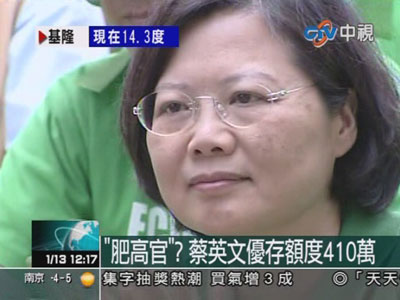 馬英九批評民進黨版18%(臺灣軍公教18%優利存款)政策改革造成肥高官、瘦小吏,據藍營人士透露,民進黨主席蔡英文優存額度達410萬元(新臺幣,下同),換算年領優惠利息73萬元,在民進黨退休政務官員中,優存額度最高,優惠利息也最多,屬最肥高官。臺灣世新大學傳播所長游梓翔斷言,如果情況屬實,蔡英文2012年就不必選臺灣地區領導人了。【詳細】