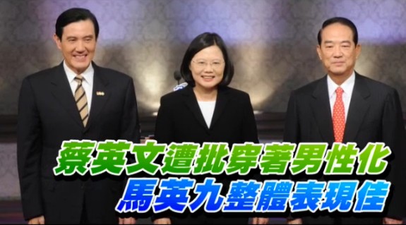 造型師皆認為,民進黨2012年臺灣地區領導人參選人蔡英文沒有凸顯女性特質,陷入男性造型的框架;馬英九與親民黨2012年臺灣地區領導人參選人宋楚瑜的領帶各有亮點,但西裝都不合身,顯得沒精神。