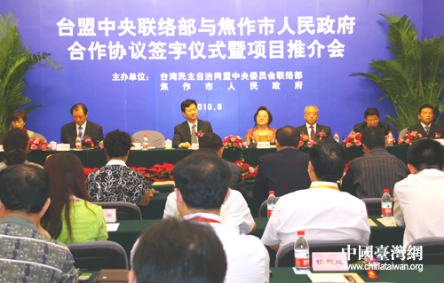 臺盟中央聯絡部與焦作市政府簽訂合作協議,推進豫臺兩地經貿合作。(中國臺灣網 孫金誠 攝)