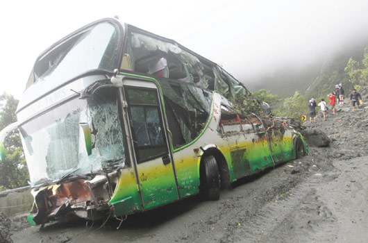蘇花公路112.8公里處一輛被砂石擊中的游覽車23日被挖出后,車體支離破碎,顯示沖擊力道之大。來源:臺(tái)灣《聯(lián)合報(bào)》