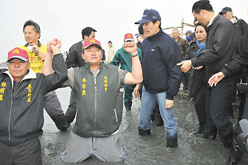 馬英九與“內政部長”江宜樺等人,4日由王功反污染自救會、彰化縣環保聯盟成員帶領,坐著采蚵車前往大城濕地巡視;海灘前,一群反“國光”民眾舉著“濕地石化無法并存”、“國光石化撤案,濕地才有未來”布條。