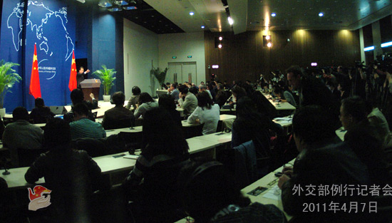 2011年4月7日,外交部發言人洪磊主持例行記者會。