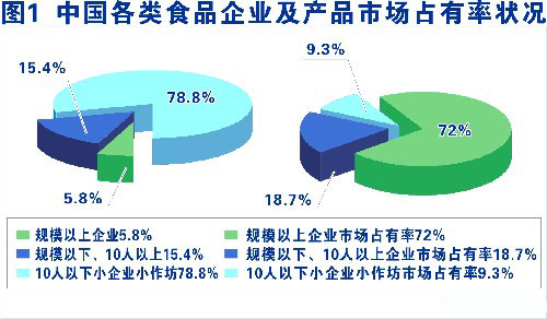 近年來,中國食品工業持續快速健康發展,經濟效益穩步提高。按照食品的原料和加工工藝不同,食品分為:糧食加工品,食用油、油脂及制品,調味品,肉制品,乳制品,飲料,方便食品,餅干,罐頭,冷凍飲品,速凍食品,薯類和膨化食品,糖果制品(含巧克力及制品),茶葉,酒類,蔬菜制品,水果制品,炒貨食品及堅果制品,蛋制品,可可及焙烤咖啡產品,食糖,水產制品,淀粉及淀粉制品,糕點,豆制品,蜂產品,特殊膳食食品及其他食品共28大類525種。目前,全國共有食品生產加工企業44.8萬家。其中規模以上企業2.6萬家,產品市場占有率為72%,產量和銷售收入占主導地位;規模以下、10人以上企業6.9萬家,產品市場占有率為18.7%;10人以下小企業小作坊35.3萬家,產品市場占有率為9.3%(見圖1)。