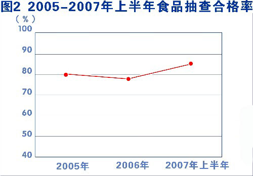 一是食品總體合格率穩步提升。2006年全國食品國家監督抽查合格率達到77.9%。2007年上半年,食品專項國家監督抽查合格率達到了85.1%。食品質量安全水平保持穩定,并呈上升態勢(見圖2)。