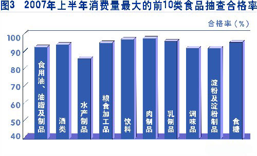 三是重點行業的食品質量達到較高水平。經過對食品生產加工企業的專項整頓,中國28大類525種食品質量安全水平都有不同程度的提高,特別是日常大量消費的重點行業的食品質量提高顯著。據統計,中國消費量最大的前10類食品分別為:食用油、油脂及制品,酒類,水產制品,糧食加工品,飲料,肉制品,乳制品,調味品,淀粉及淀粉制品,食糖。2007年上半年,除水產制品抽樣合格率為85%外,其余9類食品專項抽查合格率均在90%以上,肉制品抽樣合格率達到97.6%(見圖3)。