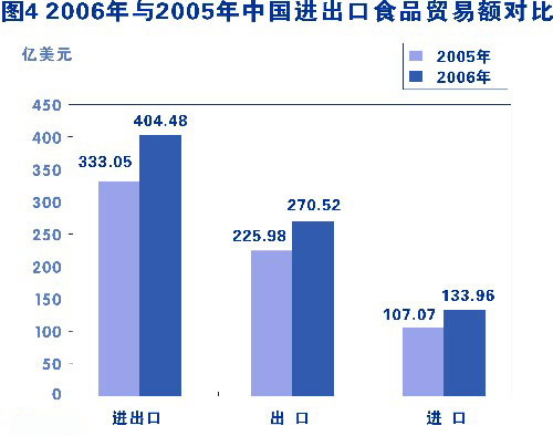 中國是食品進出口大國,多年來食品進出口不斷增長。2006年,食品進出口貿易總額為404.48億美元(不包括小麥、玉米、大豆等農產品,下同),同比增長了21.45%(見圖4)。