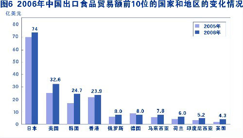 中國食品出口到200多個國家和地區,按貿易額排序前10位的國家和地區依次是:日本、美國、韓國、香港、俄羅斯、德國、馬來西亞、荷蘭、印度尼西亞、英國(見圖6)。