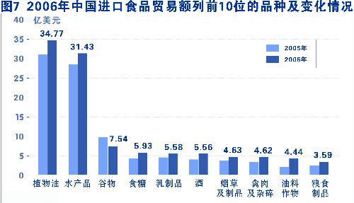 2006年,中國進口食品2027.3萬噸,貨值133.96億美元,同比分別增長了7.94%和25.11%。進口食品貨值列前10位的品種分別是:植物油、水產品、谷物、食糖、乳制品、酒、煙草及制品、禽肉及雜碎、油料作物、糧食制品(見圖7)。
