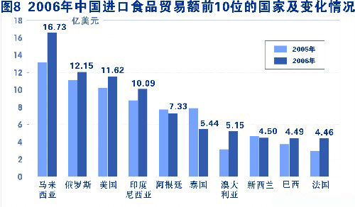 中國的進口食品來自世界上143個國家和地區,向中國出口食品貨值列前10位的國家分別為:馬來西亞、俄羅斯、美國、印度尼西亞、阿根廷、泰國、澳大利亞、新西蘭、巴西、法國(見圖8)。