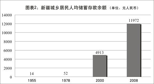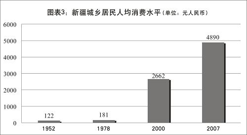在經歷了消除貧困、解決溫飽發展階段后,目前新疆各族人民生活正在向小康邁進,生活質量大幅提高。2008年,新疆農民人均純收入達3503元人民幣,比改革開放初期的1978年增長28倍,比西部大開發初期的2000年增長1.2倍;城鎮居民人均可支配收入11432元人民幣,比1978年增長35倍,比2001年增長1倍。城鄉居民人均儲蓄存款余額1955年為14元人民幣、1978年為52元人民幣、2000年為4913元人民幣,2008年為11972元人民幣。居民人均消費水平1952年為122元人民幣、1978年為181元人民幣、2000年為2662元人民幣,2007年為4890元人民幣。