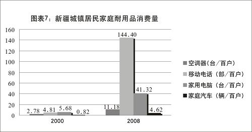 城鄉居民家庭耐用消費品數量不斷增長。農村居民家庭每百戶擁有洗衣機數量從1990年的12.58臺、2000年的20.87臺,增長到2008年的38.00臺;冰箱數量從1990年的0.40臺、2000年的9.93臺,增長到2008年的30.32臺;摩托車數量從1990年的1.37輛、2000年的18.33輛,增長到2008年的50.77輛;移動電話數量從2000年的0.33部,增長到2008年的54.00部。城鎮居民家庭每百戶擁有空調器從2000年的2.78臺增長到2008年的11.18臺;移動電話從2000年的4.81部增長到2008年的144.40部;家用電腦從2000年的5.68臺增長到2008年的41.32臺;家庭汽車從2000年的0.82輛增長到2008年的4.62輛。
