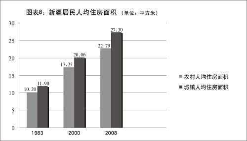 人民群眾生活條件不斷改善。交通工具多樣化使人們出行更加方便快捷,改革開放初期從烏魯木齊到北京乘火車需耗時近一周,現今乘飛機僅需3個多小時。城市每萬人擁有鋪裝道路由1978年的1.6公里、2000年的4.5公里,增長到2008年的15.7公里;城市每萬人擁有公共汽車數量從1978年的3.1標臺,增加到2008年的13.2標臺。住房條件得到極大改善。農村人均住房面積從1983年的10.20平方米、2000年的17.25平方米,增長到2008年的22.79平方米;城鎮人均住房面積從1983年的11.90平方米、2000年的20.06平方米,增長到2008年的27.30平方米。目前,全疆設市城市自來水普及率為97.86%,縣城為87.18%;城鎮集中供熱普及率為51.2%,污水處理率為68%,生活垃圾無害化處理率為16%;城市燃氣普及率為89.33%,縣城為66.67%;城市綠化覆蓋率為30.49%,綠地率為26.19%,人均公共綠地面積為6.94平方米。近年來,南疆庫爾勒、和田、喀什、阿圖什、阿克蘇、墨玉、洛浦、疏勒等23個縣市的30多萬戶各族群眾用上了清潔且價格優惠的天然氣。目前,南疆地區天然氣新用戶以每月上千戶的規模增長,“砍胡楊、燒胡楊”正在成為歷史。