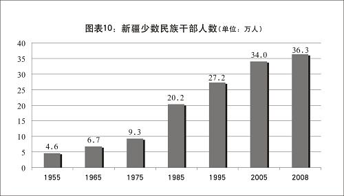 國家和自治區一直把選拔、培養和使用少數民族干部作為實行民族區域自治政策的關鍵,通過送去學習、加強培訓、基層鍛煉、異地交流、掛職輪換等多種形式,培養和造就了一大批優秀少數民族干部,少數民族干部隊伍的人數和素質大幅提高,并保證各級各類少數民族干部的相應比例。1955年,全疆有少數民族干部4.6萬人,1965年為6.7萬人,1975年為9.3萬人,1985年為20.2萬人,1995年為27.2萬人,2005年為34.0萬人,2008年為36.3萬人,占全疆干部總數的51.25%。目前,自治區的政府主席、各自治州的州長、自治縣的縣長以及相應的人大常委會主任、人民法院院長、人民檢察院檢察長都由實行民族區域自治的民族的公民擔任,絕大多數的地、州、市的專員、州長和市長以及縣長、區長由少數民族干部擔任。