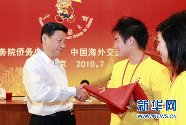 7月25日,中共中央政治局常委、國家副主席習(xí)近平在北京人民大會堂出席2010年海外華裔及港澳臺地區(qū)青少年“中國尋根之旅”夏令營開營式并講話,向營員代表頒授營旗。這是習(xí)近平向營員代表頒授營旗。新華社記者 謝環(huán)馳 攝