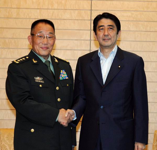 2007年8月30日,正在日本進(jìn)行正式友好訪問(wèn)的中央軍委副主席、國(guó)務(wù)委員兼國(guó)防部長(zhǎng)曹剛川上將在東京會(huì)見(jiàn)了日本首相安倍晉三。