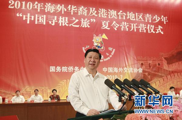 7月25日,中共中央政治局常委、國家副主席習近平在北京人民大會堂出席2010年海外華裔及港澳臺地區青少年“中國尋根之旅”夏令營開營式并講話,向營員代表頒授營旗。這是習近平在開營式上講話。新華社記者 謝環馳 攝