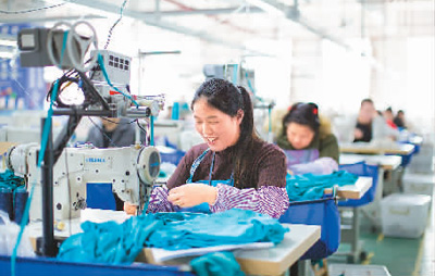 在黔東南苗族侗族自治州榕江縣工業(yè)園區(qū),搬遷群眾在制作衣服。