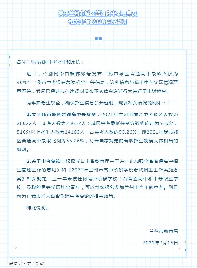 中考無復讀機會?蘭州教育局辟謠:未出臺相關政策