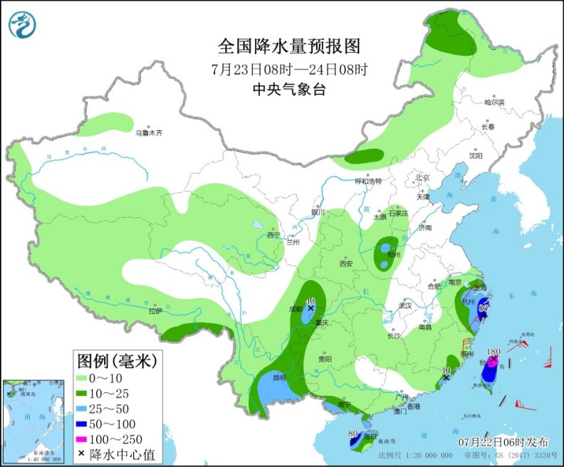 7月23日08時(shí)至24日08時(shí),內(nèi)蒙古東北部、西藏東南部、河南中西部、江南東部、西南地區(qū)東部和南部、廣西南部、海南島、臺灣島等地部分地區(qū)有中到大雨,其中,浙江東部、海南島西北部、臺灣島等地部分地區(qū)有暴雨或大暴雨(100~180毫米)。浙江、福建東部等地部分地區(qū)有5~6級風(fēng)。