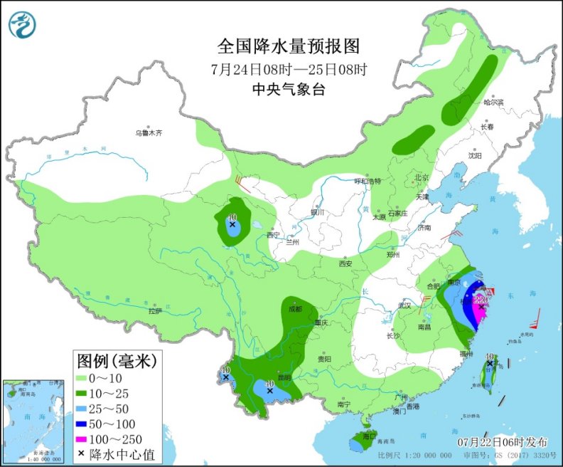 7月24日08時(shí)至25日08時(shí),內(nèi)蒙古東南部、黑龍江西南部、青海北部、江南東部、西南地區(qū)東部和南部、海南島、臺灣島等地部分地區(qū)有中到大雨,其中,上海大部、浙江中東部等地部分地區(qū)有暴雨或大暴雨(100~220毫米)。甘肅河西、湖北東部等地部分地區(qū)有4~6級風(fēng)。