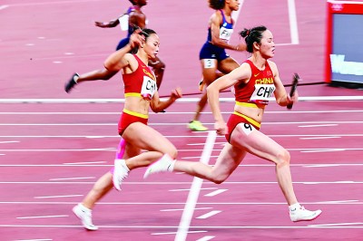 8月6日,田徑女子4×100米接力決賽在新國立競技場舉行。圖為中國隊隊員韋永麗(右)、黃瑰芬在比賽中。新華社發