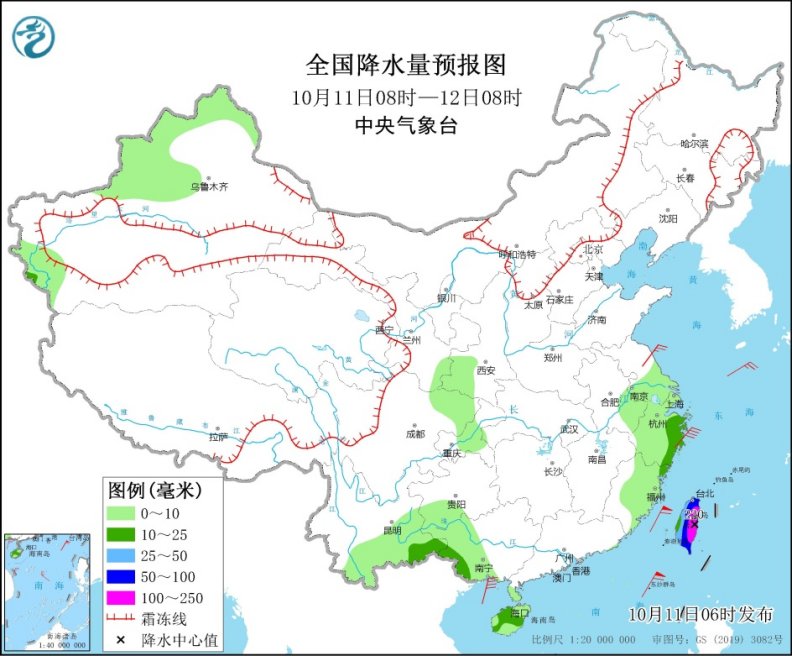 10月11日08時(shí)至12日08時(shí),新疆西北部的部分地區(qū)有小雨或雨夾雪;云南東南部、廣西西南部、海南島、臺(tái)灣島等地部分地區(qū)有中到大雨,其中,臺(tái)灣島中東部的部分地區(qū)有暴雨或大暴雨(100~220毫米)。江南東部、華南東部等地部分地區(qū)有4~5級(jí)風(fēng)。