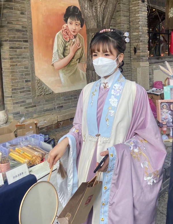 躍上石橋,橋下幾尾魚兒咧嘴笑,在蓮間嬉戲,吵得石縫中的泥鰍不禁抱怨了起來。小跑著進(jìn)了有著像錦鯉一般花紋的布匹的染坊,夕陽(yáng)下影子被拉得斜長(zhǎng),風(fēng)吹拂著布匹,長(zhǎng)長(zhǎng)的從竹竿上垂落,手上忘記了是在哪系的彩繩,和淡雅的粗布相互呼應(yīng)。拉扯著布匹,把布角在手指間揉搓,弄得它皺皺巴巴的。紅色的裙擺被香風(fēng)吹拂,在這里竟顯得有些俗艷了。心頭有些不舒服,一絲愧疚爬上來,便羞得跑開了。