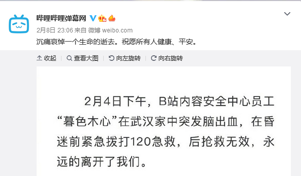 通報(bào)中稱,2月4日下午,B站內(nèi)容安全中心員工“暮色木心”在武漢家中突發(fā)腦出血,在昏迷前緊急撥打120急救,后搶救無(wú)效離世。