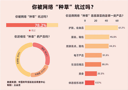 不少網友都有類似劉女士的經歷。去年國慶期間,一則“粉紅沙灘”的筆記,吸引無數網友前去打卡,結果“浪漫美景”實為土褐色土地加上粗糙沙礫,讓人大跌眼鏡。有網友還曬出了自己的遭遇:被“種草”某款化妝品,用完后臉發癢,查詢后得知是“三無產品”。中國青年報前不久一項調查顯示,78.2%的受訪者有被網絡“種草”坑過的經歷,61.7%的受訪者認為護膚品、化妝品是網絡“種草”容易踩雷的產品。