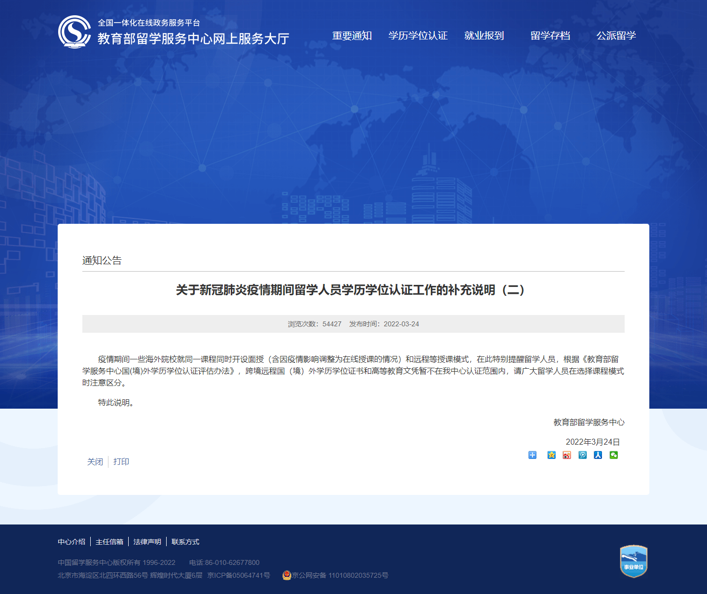 此外,據教育部留學服務中心早前發布的消息稱,國(境)外學歷學位認證結果(以下稱認證結果)落款日期為認證評估完成后電子證照認證結果的發放日期,與留學人員的學習經歷及學位授予時間無關。認證結果不等同于國(境)外學歷學位證書,其落款日期對留學人員學習經歷等實際情況不產生影響,不能作為判斷相關事項的依據,教育部留學中心亦無法對已出具的認證結果落款日期作出修改。