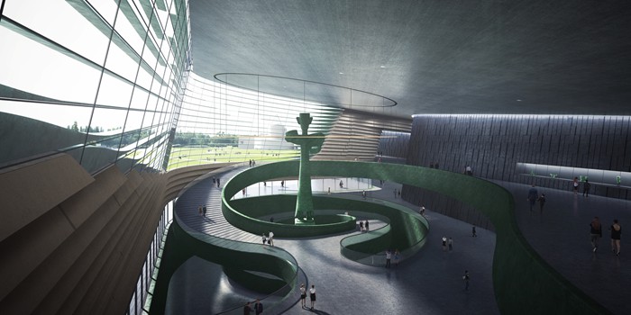 設計師們發現,三星堆博物館青銅館的螺旋外墻早已成為三星堆博物館的標志,“我們將這種曲線延續發展,并從三星堆青銅面具、青銅人頭像上無處不在的青銅眼的線條,作為三個堆體外形和內部空間的控制曲線。”新館屋頂采用斜坡覆土形態,建筑消隱融入環境,與一號館形體左右呼應;建筑形成三個沿中軸排列的覆土堆體,也寓意“堆列三星”。此外,三個堆體的平面控制線延長相交于一點,讓建筑生成獨特的形體韻律。博物館主體建筑外形追求與地貌、史跡及文物造型藝術相結合的神韻,也體現了博物館“館園結合”之特色。